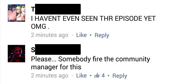 There’s a certain etiquette that’s developed for fan reactions to live television on social media. Don’t openly spoil something until people have time to catch up. People who disregard this are the exact reason I steered clear from social media when I worked nights. But it’s worth reiterating that The Walking Dead spoiler didn’t come from a fan of the show. In fact, I didn’t see (and still haven’t seen) a single spoiler from fans of the show on my Facebook newsfeed. If the sampling of viewers I have on my Facebook friends list can refrain from spoilers, why can’t community managers who work for the company producing the show grasp that concept?